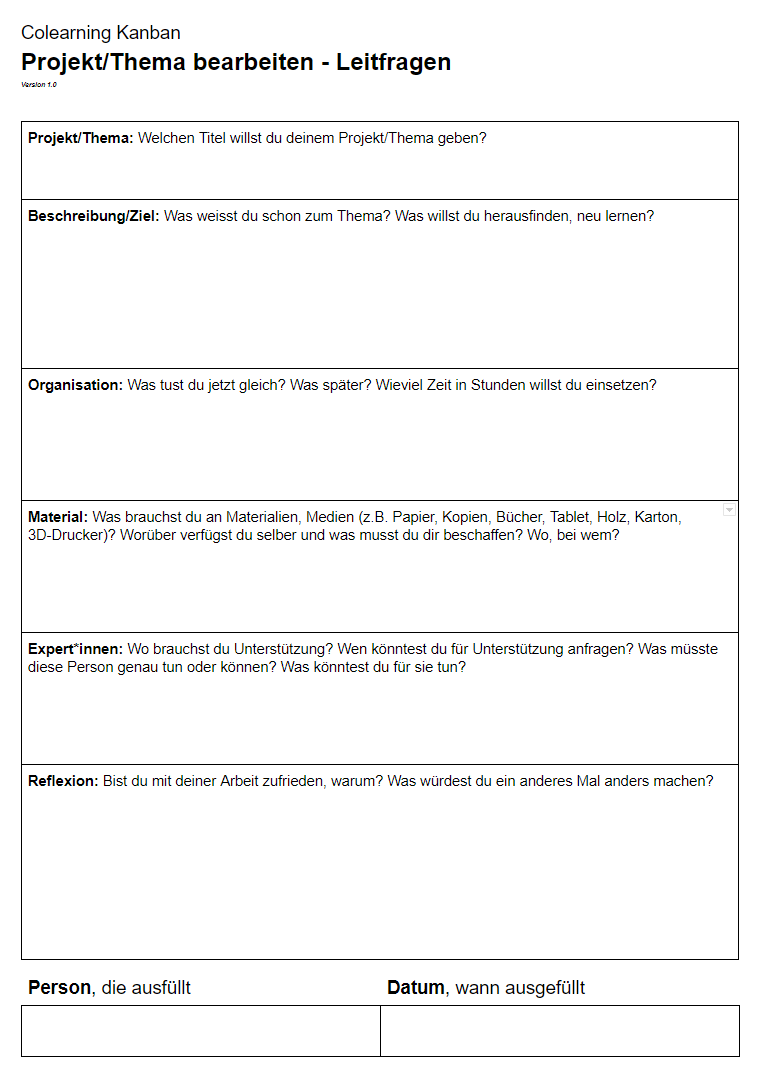Um den ganzen Prozess zu unterstützen, überlegen wir, ob wir anstatt Post-its vordefinierte Formularblätter brauchen wollen. Das würde etwas mehr Struktur hinein bringen. Allenfalls könnte man gleich die Reflexion auf diese Blätter schreiben und in das Lerntagebuch einordnen. Verwendet haben wir es noch nicht, aber hier ist mal ein erster Entwurf (Danke Fredi).